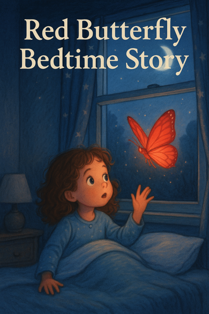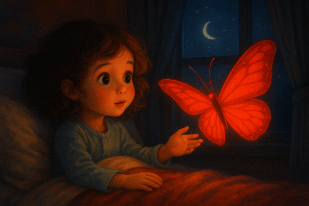 - One night, just as the stars began to twinkle and the moon rose high in the sky, a soft glow appeared outside her window. It wasn’t a firefly, and it wasn’t the moon. It was a butterfly — but not just any butterfly. It was red. Bright, shimmering, glowing red, like a ruby kissed by starlight.